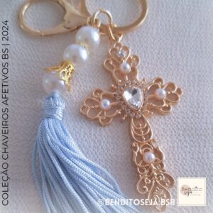Chaveiro dourado com cruz em strass, com tassel azul bebê