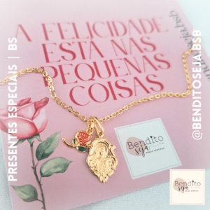 Colar tamanho 44 cm com medalha de Santa Teresinha 1,5 cm e pingente rosinha. Semijoia banhada a ouro 18k, sem níquel, antialérgica.