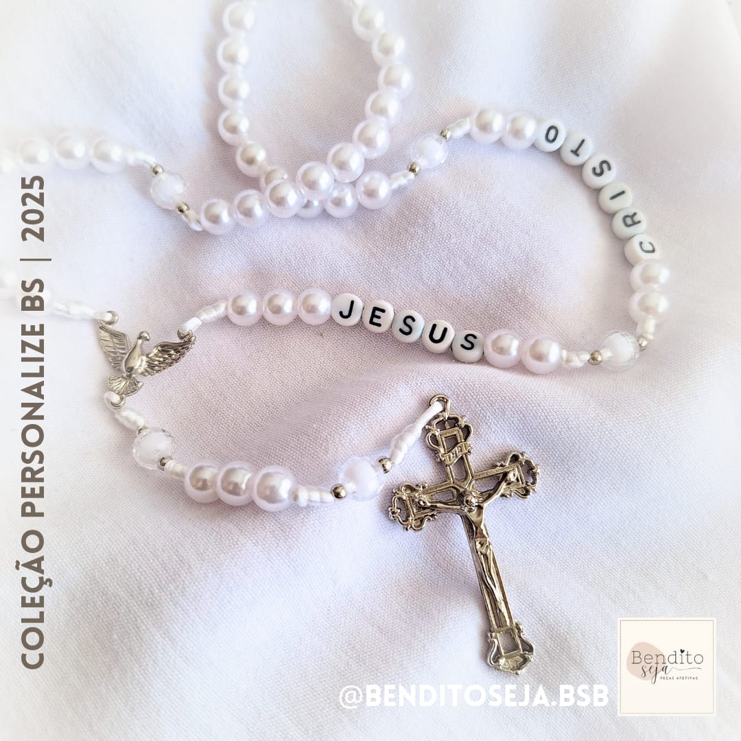 Terço tradicional com contas tamanho 6 na cor pérola, detalhe do Pai Nosso em rosa alpaca banhada a prata italiana e entremeio com a imagem de Nossa de Guadalupe e rosa.