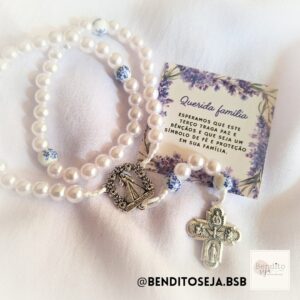 Terço em pérolas e contas de cerâmica florida em azul de Jesus Misericordioso com amarração em fita de cetim, crucifixo italiano banhado a prata e cruz de todos santos contendo: Espírito Santo, Menino Jesus de Praga, Medalha Milagrosa, Nossa Senhora de Fátima, São Cristóvão, São José, Sagrado Coração de Jesus e Santo Antônio.