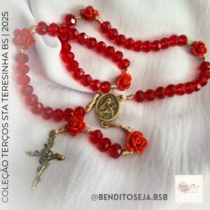Terço em de cristal contas de 8mm e detalhe de rosas vermelhas